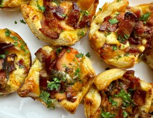 Using a rolling pin, roll 1 sheet of thawed puff pastry into a rectangle approximately 12” x 9”. Cut the sheet into 12 equal squares (approx. 3” x 3” each). Coat a standard size muffin tin with non-stick spray. Place one square of the puff pastry in each hole, stretching slightly as needed to create line the cavities and create ‘cup-like’ shapes.