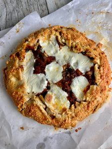 Place the eggplant and mushroom mixture in the center of the dough and spread it into a thick, even layer, leaving about 2-3” of crust exposed around the edges. Lay the mozzarella slices evenly on top of the filling.