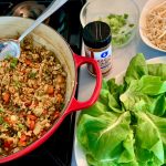 Serve the hot chicken mixture, garnished with sesame seeds in a serving bowl with lettuce leaves and bean sprouts on the side.  To assemble the lettuce wraps, place about ¼ cup of the chicken mixture on a lettuce leaf, top with bean sprouts and roll together like a taco… devour!!