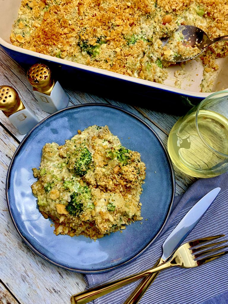 Melt the remaining 4 tablespoons of butter in the same skillet and add the cracker crumbs and panko. Cook tossing until well coated and lightly browned, about 3-4 minutes. Top the casserole with the crumbs and squeeze the lemon juice over the top.