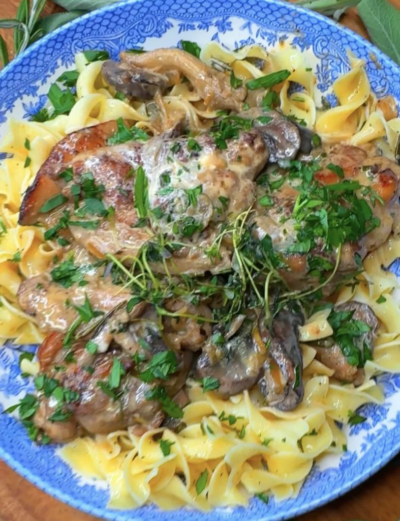 Add the chicken back to the pan along with any drippings that have formed on the plate. Toss the chicken in the sauce until well coated. Add the noodles and parsley to the pan and toss again. Serve hot in bowls. DEVOUR!!