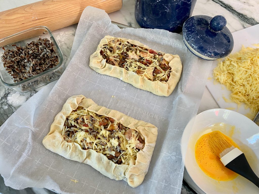 Crumble the garlic herb cheese evenly over both pieces of dough, leaving 1” of dough exposed around the edges. Top the garlic herb cheese with the cooled filling, and then sprinkle the Gruyere over the top.