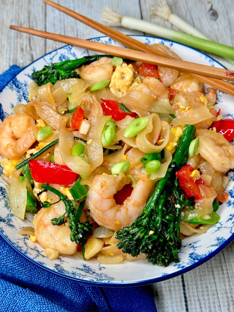 While the noodles soften drain the shrimp (reserving any liquid from the package and adding it to your sauce). Also, chop and prepare all of your veggies. This dish comes together very quickly when you start cooking!