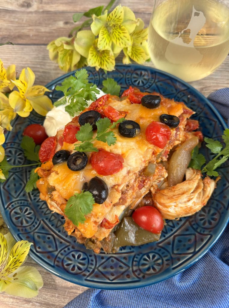Spread ½ cup of salsa on top of tortillas followed by ⅓ of the chicken, ⅓ of the onions & peppers, ¼ of tomatoes, 1 ¼ cups of the cheese, and salsa again.  Top with another two tortillas and repeat layers two more times.  Your top layer will end with tortillas, salsa, cheese, tomatoes, and the black olives.
