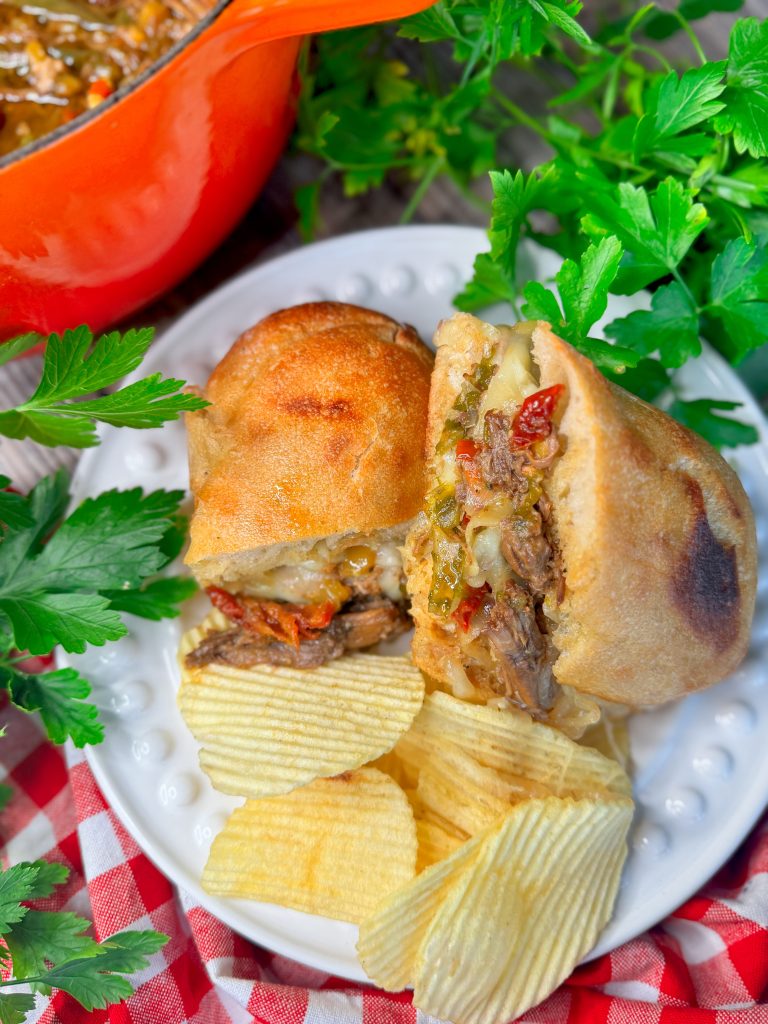 Add the beef stock and Worcestershire to the pan.  Give a quick stir so everything is well combined.  Cover the pot and place it in the oven.  Cook for 1 hour and remove the pan from the oven.  Flip the meat over and place it back in the oven for another hour.  Flip the meat over again and cook for another 30-45 minutes until the meat is falling apart.   Shred the meat in the cooking liquid with 2 forks.  Add the jar of sundried tomatoes and stir to combine.  Keep warm on the stovetop until you are ready to assemble the sandwiches.