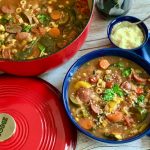 Heat olive oil in a 6-8 quart Dutch oven or large soup pot. Add the onions, garlic, and leeks and cook until fragrant. Add the kielbasa and cook for 5 minutes, stirring frequently until the kielbasa begins to lightly brown. Add the mushrooms, peppers, and carrots to the pot and continue to cook for 5 more minutes, stirring frequently.