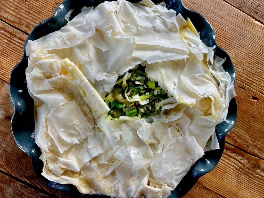 Using a pastry brush, coat the bottom of a 9” or 10” pie plate with the melted butter. Place 1 sheet of the phyllo into the bottom of the pie plate, folding it to fit, and brush the top with more butter. Do this 2 more times in the bottom of the plate, coating each layer with butter. Note – if the phyllo tears or folds, do not worry! No one will know and it will still be delicious.