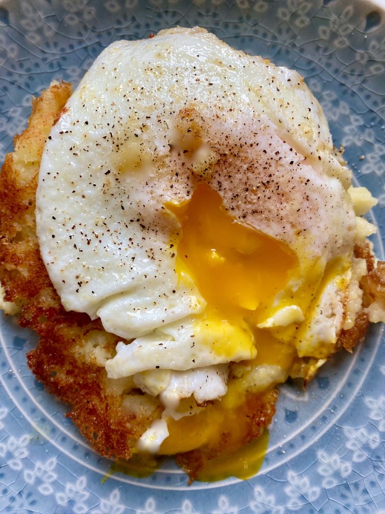LEFTOVER FRIED MASHED POTATO PANCAKES AND EGGS
