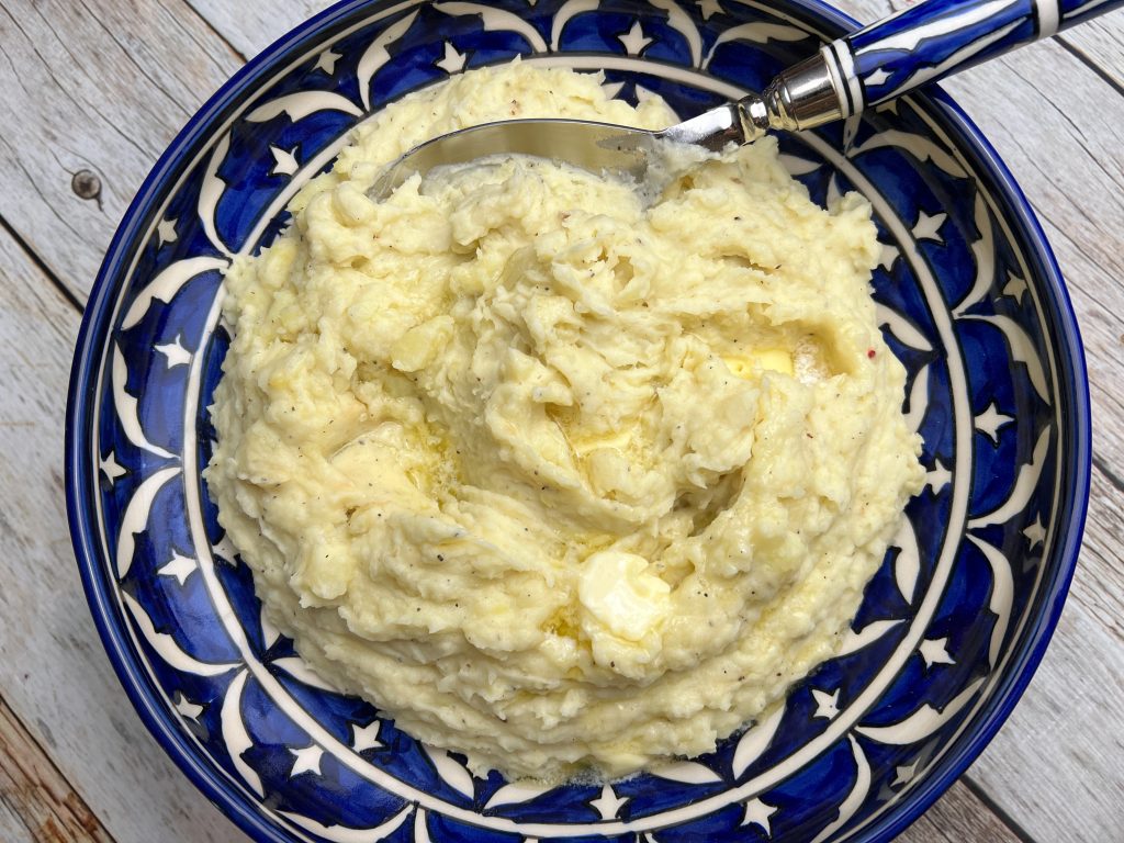 Form your mashed potatoes into 2 patties that are about 1-1 ½” thick with your hands.  Melt 2 tablespoons of the butter in a large non-stick skillet over medium high heat.  Add the potato patties to the pan and cook for 3-4 minutes on the first side until you begin to see browning around the edges.  Flip over when they are golden brown and crispy on the first side.