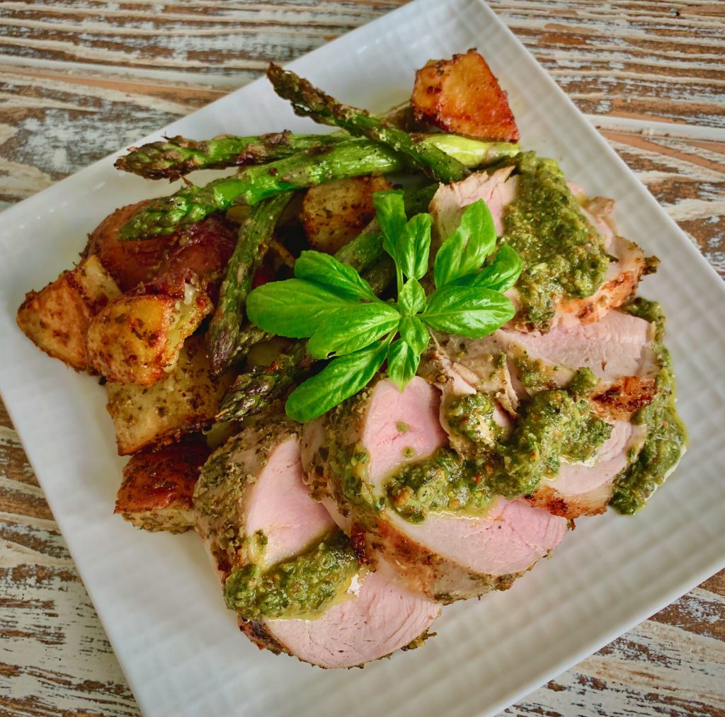 PISTACHIO PESTO RUBBED PORK TENDERLOIN WITH PESTO ROASTED POTATOES AND PESTO DRIZZLE