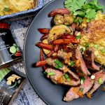 Cut the steak against the grain into thin slices. Serve with a generous scoop of the potato gratin (you’ll still go back for more – trust me) and veggies… Drizzle more of the Serious Foodie Indonesian Sambal Hot Sauce as desired.
