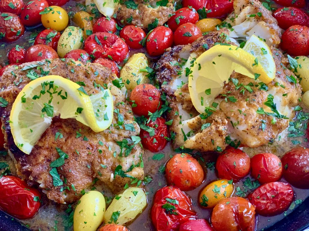 SUPERBLY HERBY PAN SEARED COD AND TOMATO SKILLET