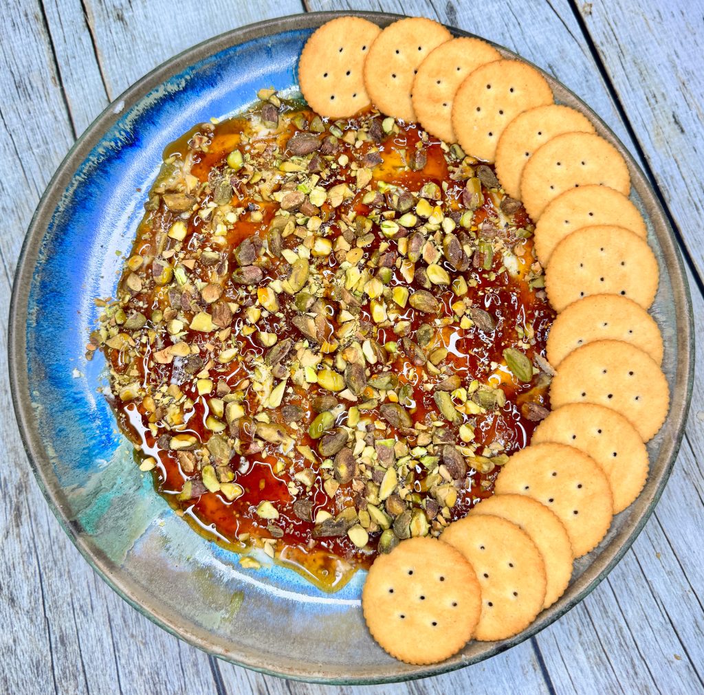 Spread the Boursin cheese evenly in the bottom of a pie plate or similar size platter. Spread the fig preserves evenly on top of the Boursin and sprinkle the pistachios over the top. Drizzle the hot honey over the top. Serve with crackers for dipping.
