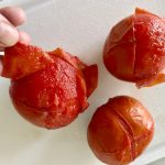 With a paring knife, cut a small “X” into the skin on the bottom of each tomato. Place the tomatoes in the boiling water for 30-40 seconds until the skin is starting to ‘peel’ where you made the “X”. Place the tomatoes in the ice bath for 30 seconds. Remove the tomatoes from the ice bath to the paper towels.