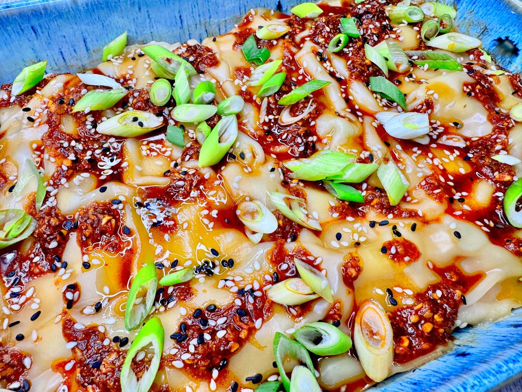 Drizzle the top with soy sauce, chili crisp, and a little bit of sesame oil. Garnish with chopped scallions and sesame seeds.