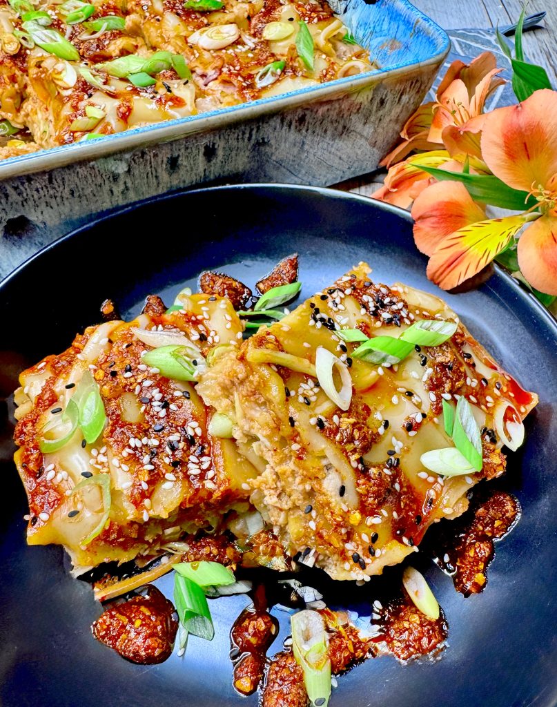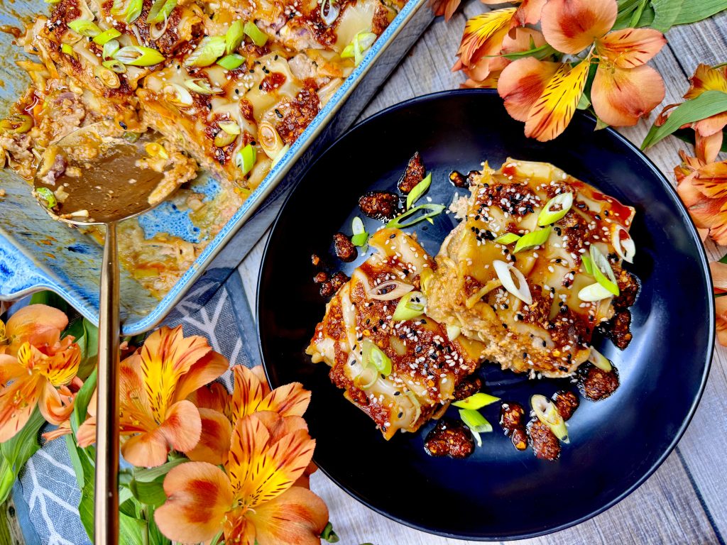 Place 8-12 dumpling wrappers, slightly overlapping, in the bottom of the baking dish, dipping each in water first to coat. Spread ⅓ of the pork mixture in an even layer over the wet wrappers. Repeat with another layer of wet wrappers followed by another layer of pork mixture. Repeat one more time and finish with a layer of the wrappers.